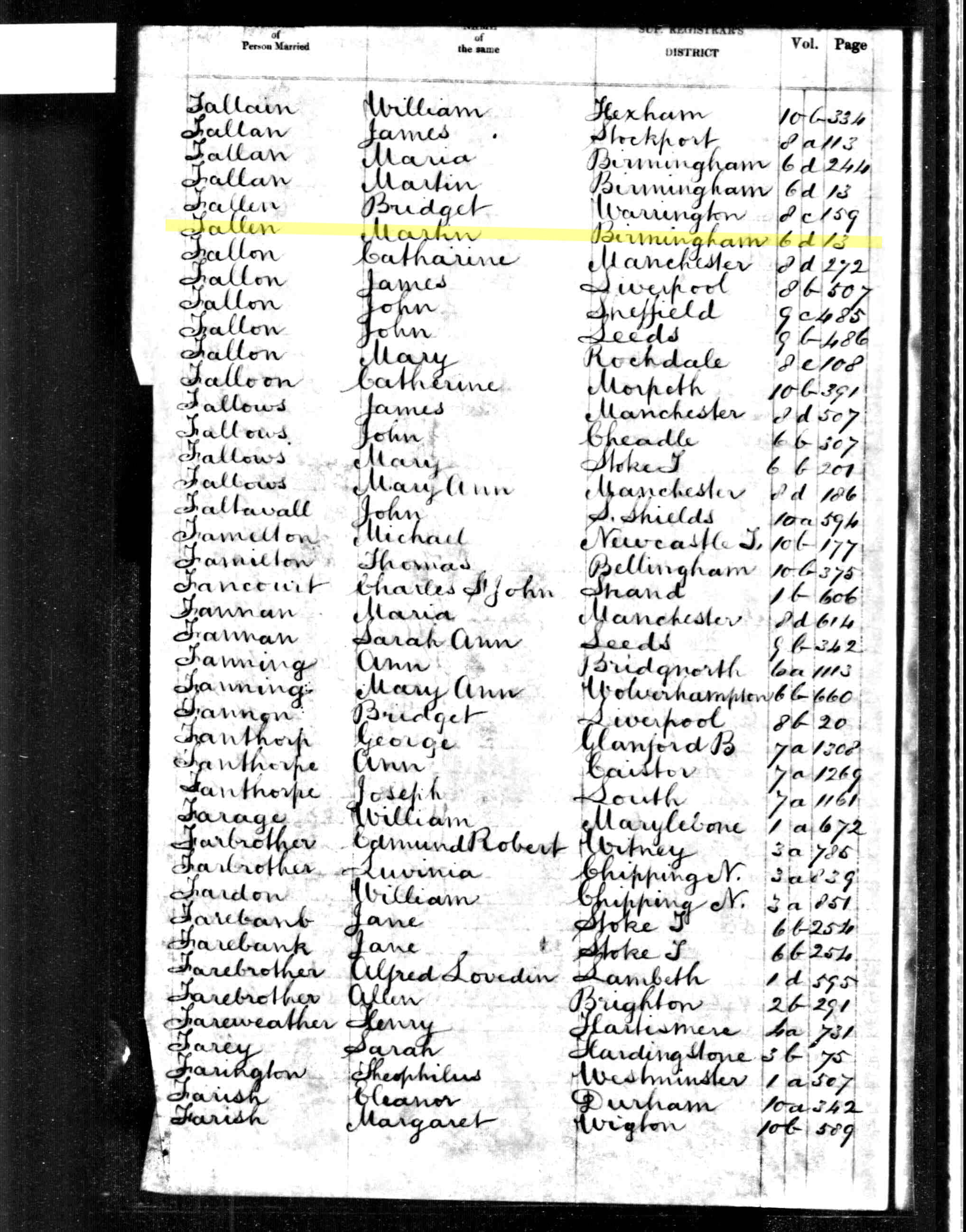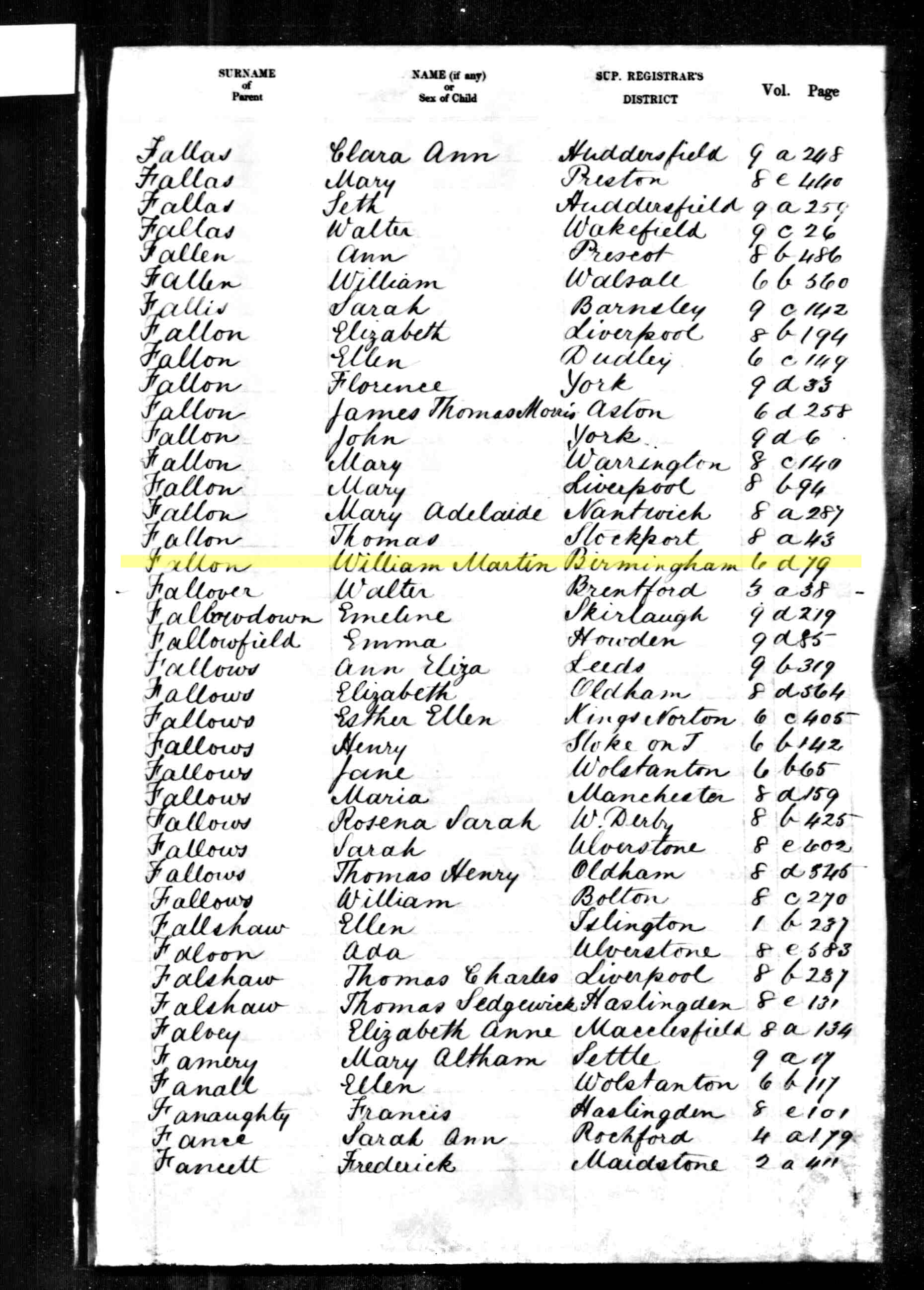 Well, it’s looking as though old Mr Fallon wasn’t an Irish Tinker[2] after all, but a Brummy. Born, lived and died in Birmingham’s fair city. I can’t be absolutely certain, but the evidence is pointing that way.