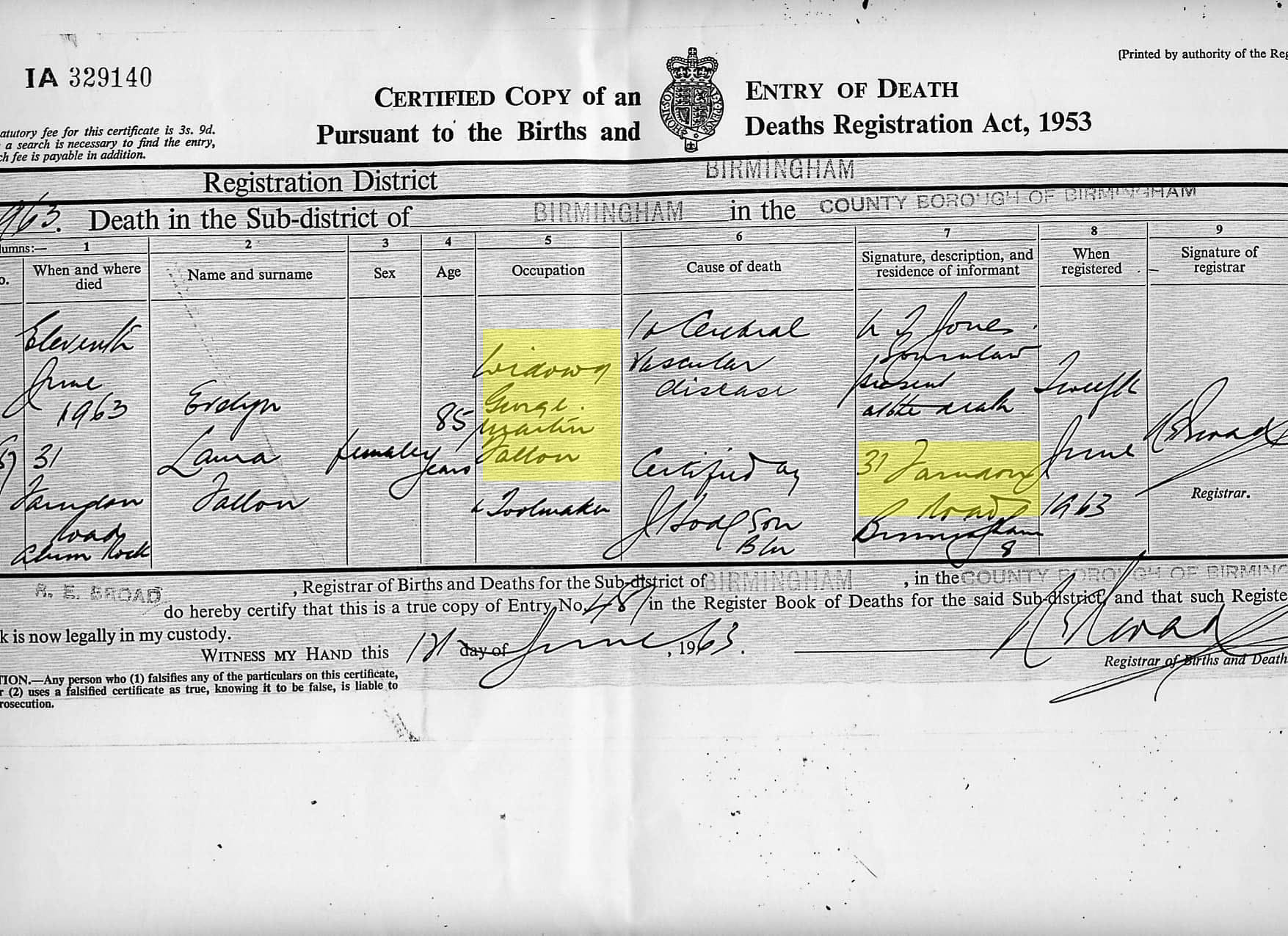 Granny Fallon’s death certificate may be inaccurate, since the details were registered by my father, who could never have met Mr Fallon, but it does give her full name Evelyn Laura (Elizabeth) Fallon, which helped find their