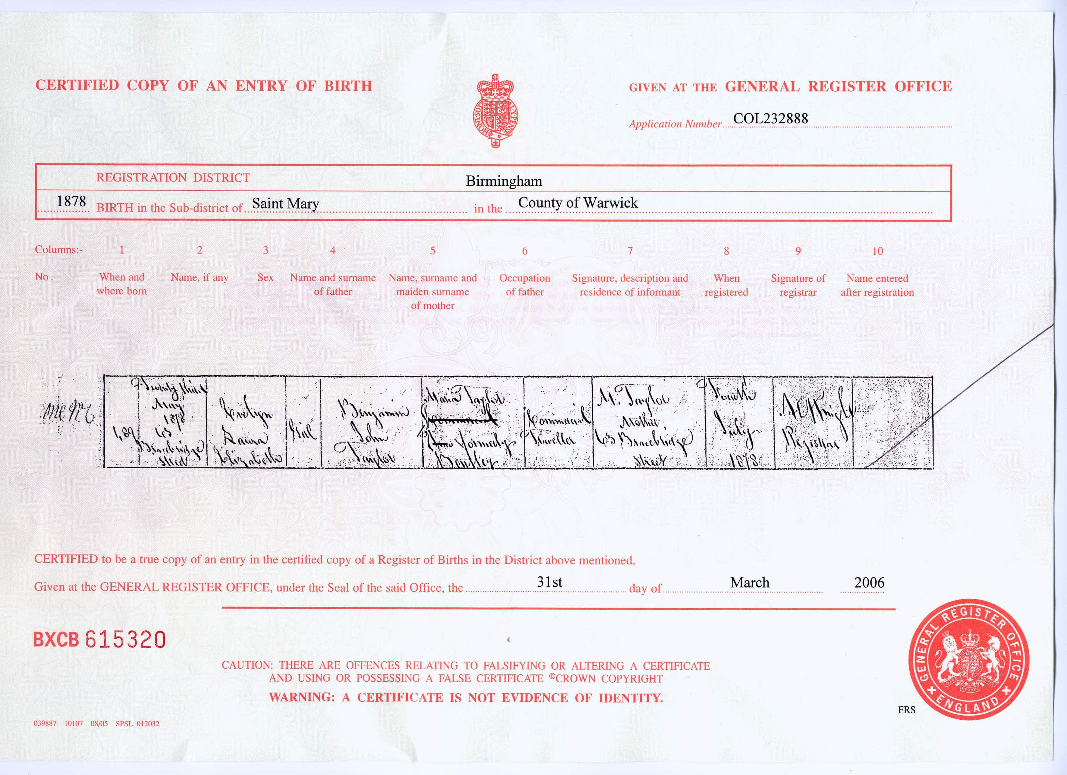 Taylor, Eveline [Birth Certificate].jpg, which confirms her parent’s names: Benjamin John Taylor and Maria Taylor (Her name is clearer on the wedding certificate as a witness).